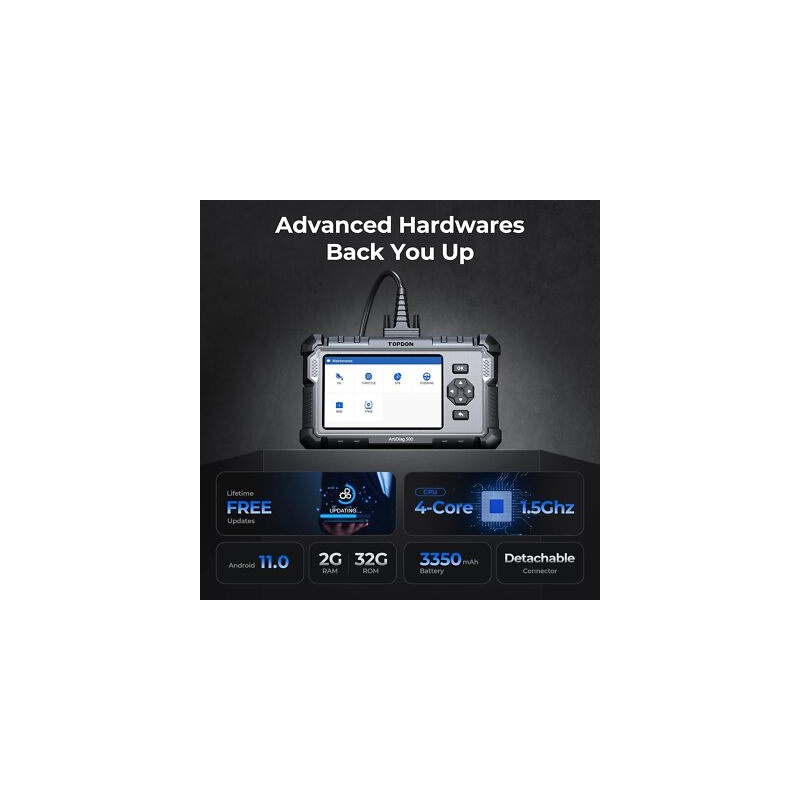 Kogege täiustatud jõudlust täiustatud ArtiDiag500 diagnostikatööriistaga, millel on 4-tuumaline 1,5 GHz protsessor, 2 GB muutmälu + 32 GB muutmälu ja sujuv töö Android 11.0-ga. Nautige pikemat aku tööiga selle 3350 mAh mahutavusega.